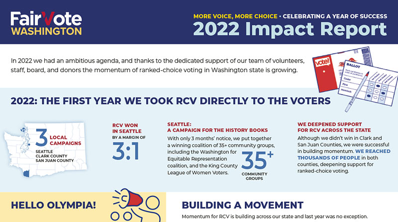 Fairvote Washington continues to build momentum for RCV in Washington State. Read about our productive year in this report.