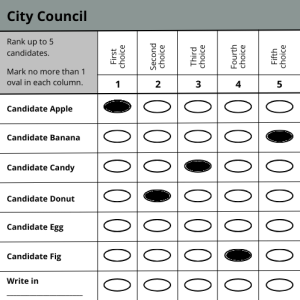 With RCV, you have the option to rank candidates in the order you prefer. In the sample below, the voter picked “Apple” as their 1st choice, “Donut” as their 2nd, “Candy” as their 3rd, etc.