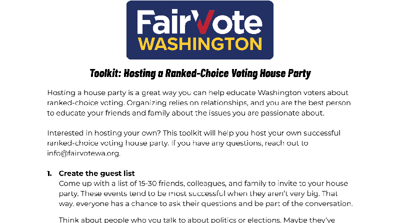 Hosting a house party is a great way you can help educate Washington voters about ranked-choice voting. Organizing relies on relationships, and you are the best person to educate your friends and family about the issues you are passionate about. This toolkit will help you host your own successful ranked-choice voting house party.