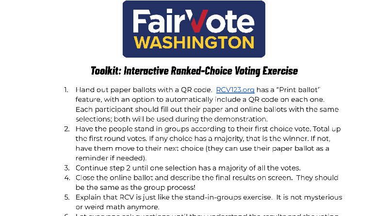 This hands-on election process is one of the most effective methods we use to help voters understand the ranked-choice voting process. We recommend using it with any group that wants to learn more about RCV.