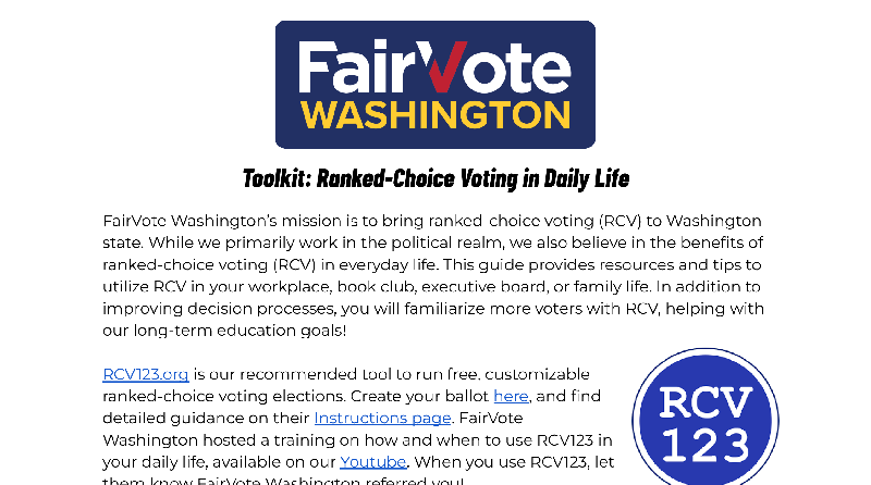 While we primarily work in the political realm, we also believe in the benefits of ranked-choice voting (RCV) in everyday life. This guide provides resources and tips to utilize RCV in your workplace, book club, executive board, or family life. In addition to improving decision processes, you will familiarize more voters with RCV, helping with our long-term education goals!